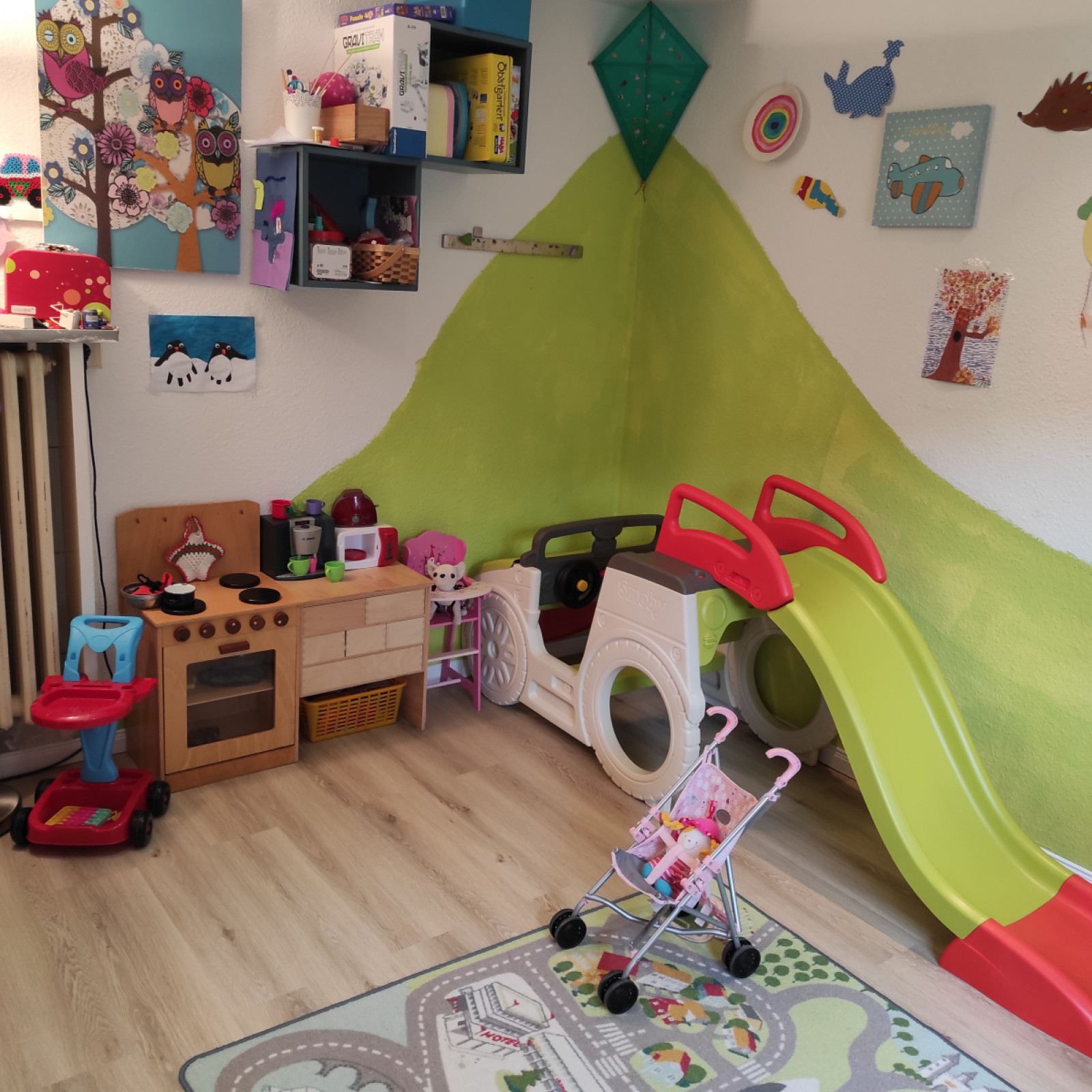 Die Räume sind an die Bedürfnisse der Kinder angepasst. Der großzügiges Spielbereich ist für die Kleinen einladend gestaltet und im Schlafbereich können sich die Kinder ausruhen und Kraft für neue Abenteuer tanken. In der geräumigen Küche kümmere ich mich um die ausgewogene Versorgung der Gruppe. Dabei binde ich die Kinder mit ein und mache das Mittagessen so zum gemeinsamen Erlebnis. Durch verschiedene eigene Bereiche schaffe ich zudem kleine Inseln zum Basteln, Spielen und Toben. Es versteht sich von selbst, dass in den Räumen nicht geraucht wird.